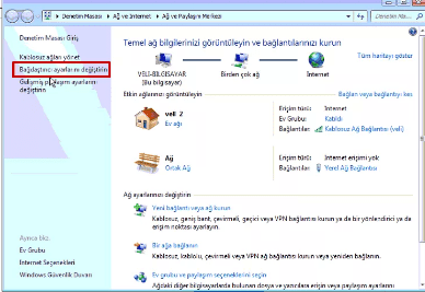 Aztech WL559E Wireless-N Access Point Kurulumunu yapabilmek için Repeater (Sinyal Artırıcı) ‘nın IP adresini bilmeniz gerekiyor. Bilmiyorsanız bilgisayar veya leptoptan bağlıysanız. İnternet simgesinin üstüne tıklıyoruz. Ağ ve paylaşım merkezini aç diyoruz. Sol bölümde yer alan bağdaştırıcı ayarları değiştirin bölümüne tıklıyoruz.