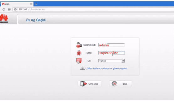 Adres satırına Huawei Hg552E modem’in IP’si olan 192.168.1.1 yazıyoruz. Enterı tuşluyoruz.
