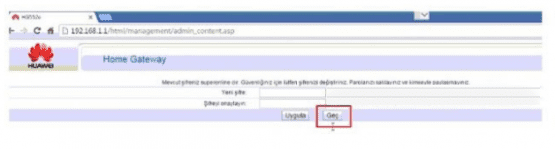 Yeni şifre şifreyi onaylayın bölümü açılacaktır bu bölümde modemin arayüz şifresi değiştirilebilir. Fakat unutulma ihtimaline karşi değiştirmeden geçmenizi öneriyoruz. Geç butonuna tıklıyorsunuz.