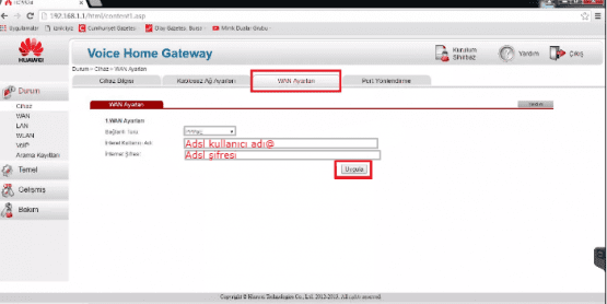 Kurulum sayfası gelecektir. Üst kısımda yer alan WAN Ayarları‘a tıklayınız.Bağlantı tipi pppoe olacak Adsl kullanıcı adı yazan bölüme, servis sağlayıcınızdan aldığınız kullanıcı adını yazıyorsunuz ve uzantısını eklemeyi unutmayın. İnternet şifresi yazan bölümede yine servis sağlayıcınızdan aldığınız şifreyi yazıp uygula diyorsunuz. Sayfa gidip tekrar aynı sayfa geri gelecektir.