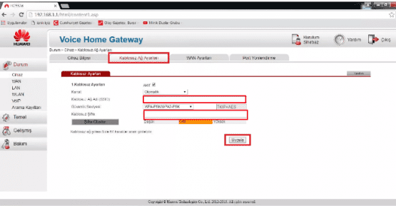 Üst kısımda yer alan kablosuz ağ ayarlarını yazan bölüme tıklıyoruz. Kablosuz ağ ayarları aktif işaretli olacak. Kanal yazan yerin karşısındaki otomatik yazan bölüme tıklıyoruz 9 veya 11’i seçiyoruz. Kablosuz ağ adı yazan böümünün karşısına daha önce kullanmadığınız kablosuz ağ adı yazıyoruz. Güvenlik seviyesi WPA-PSK/WPA2-PSK olarak kulanabiliriz. Kablosuz şifre yazan bölümün karşısına en az 8 ile 63 karekter arası unutmayacağımız kablosuz şifre yazıyoruz. Uygula butonuna tıklıyoruz. İnterneti ayarlarını yapılandırdınız. Kablolu ve kablosuz interneti kullanabilmeniz gerekiyor. Eğer interneti kablolu kablosuz kullanamazsanız servis sağlayıcınızla görüşme sağlamanız lazım. Kullanıcı adı ve şifre hatalı olabilir.