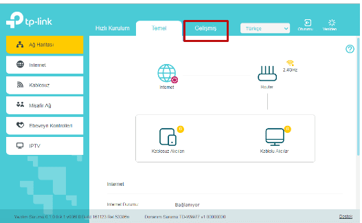 TP-Link TD W9977 modem arayüzü açılacaktır. Gelişmiş seçeneğine tıklıyoruz.