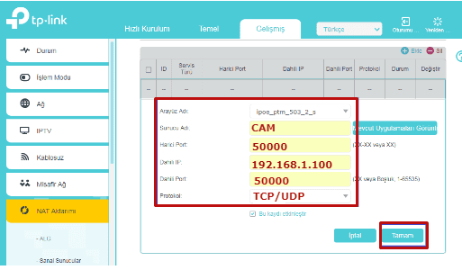 - Dahili IP: Bölümüne port açacağımız cihazın IP adresini yazıyoruz.