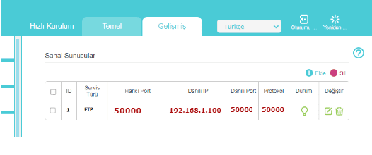 TP-Link TD W9977 modemde açacağınız farklı portlar var ise Ekle bölümünden tekrar portları açabilirsiniz. Yanlış açtığınız portlar var ise yanlış açılan portu işaretledikten sonra Sil seçeneğine tıklıyoruz. TP-Link TD W9977 modemde portlarınızı açtınız. Sorunsuz olarak kullanabilirsiniz.