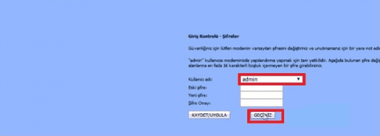 Modem arayüz şifresini değiştirmek için ekran gelecektir. Modem arayüz şifrenizi unutmanız ihtimaline karşı ‘GEÇİNİZ’ butonuna tıklamaınızı öneriyoruz.