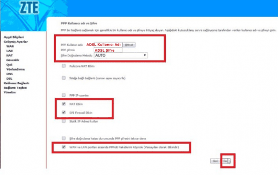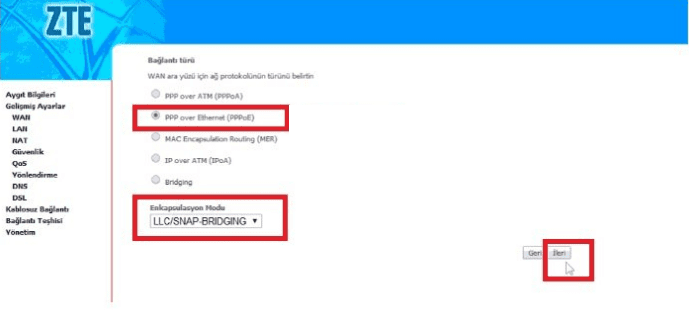 • WAN ve LAN portları arasında PPPoE Paketleri Köprüle (Varsayılan olarak Etkindir) işaretli olması gerekiyor.