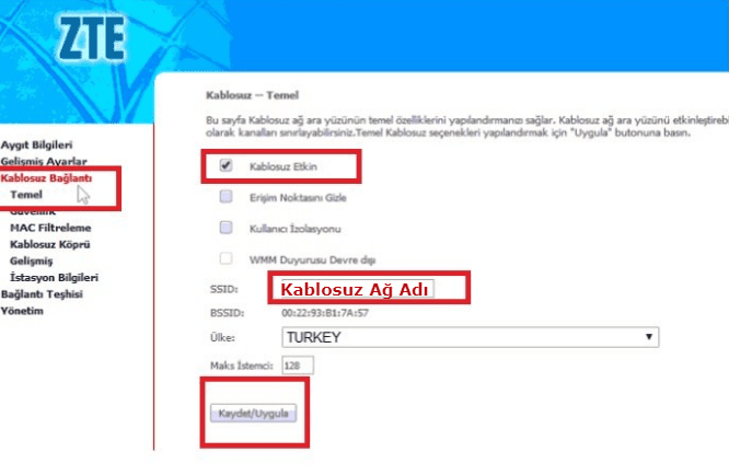 • SSID yazan bölümün karşısına Kablosuz Ağ Adı belirliyorsunuz.