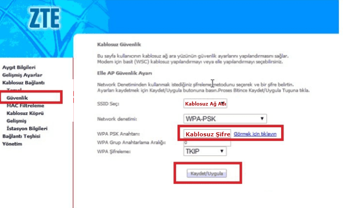 Zte zxv10w300s modem kablosuz şifre oluşturmak için Temelin altında yer alan Güvenlik seçeneğine tıklıyoruz.